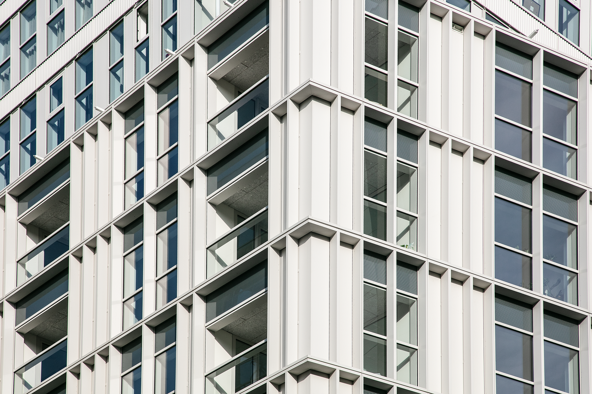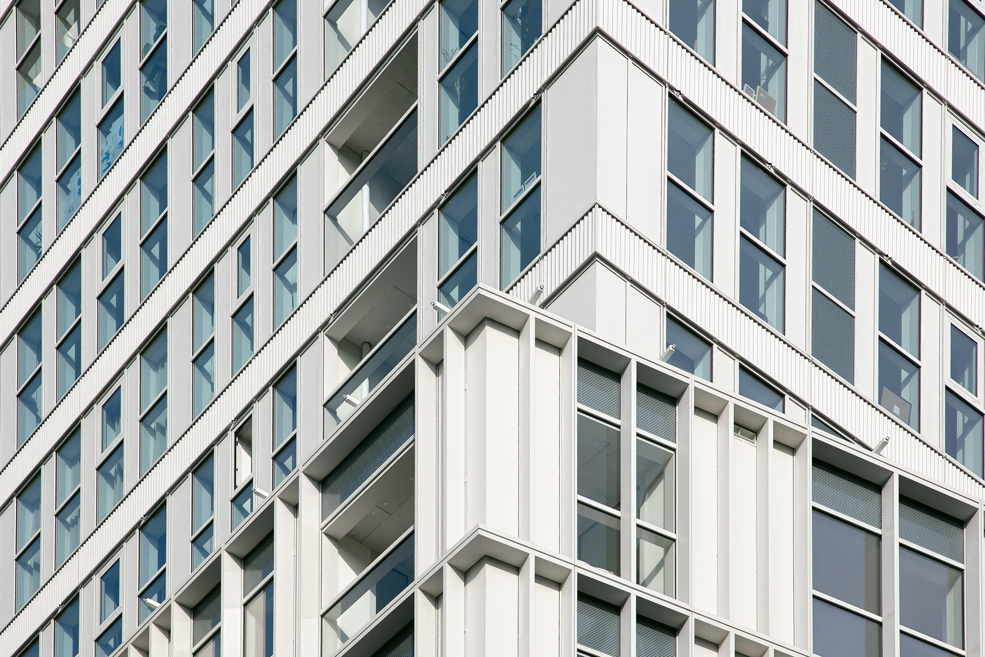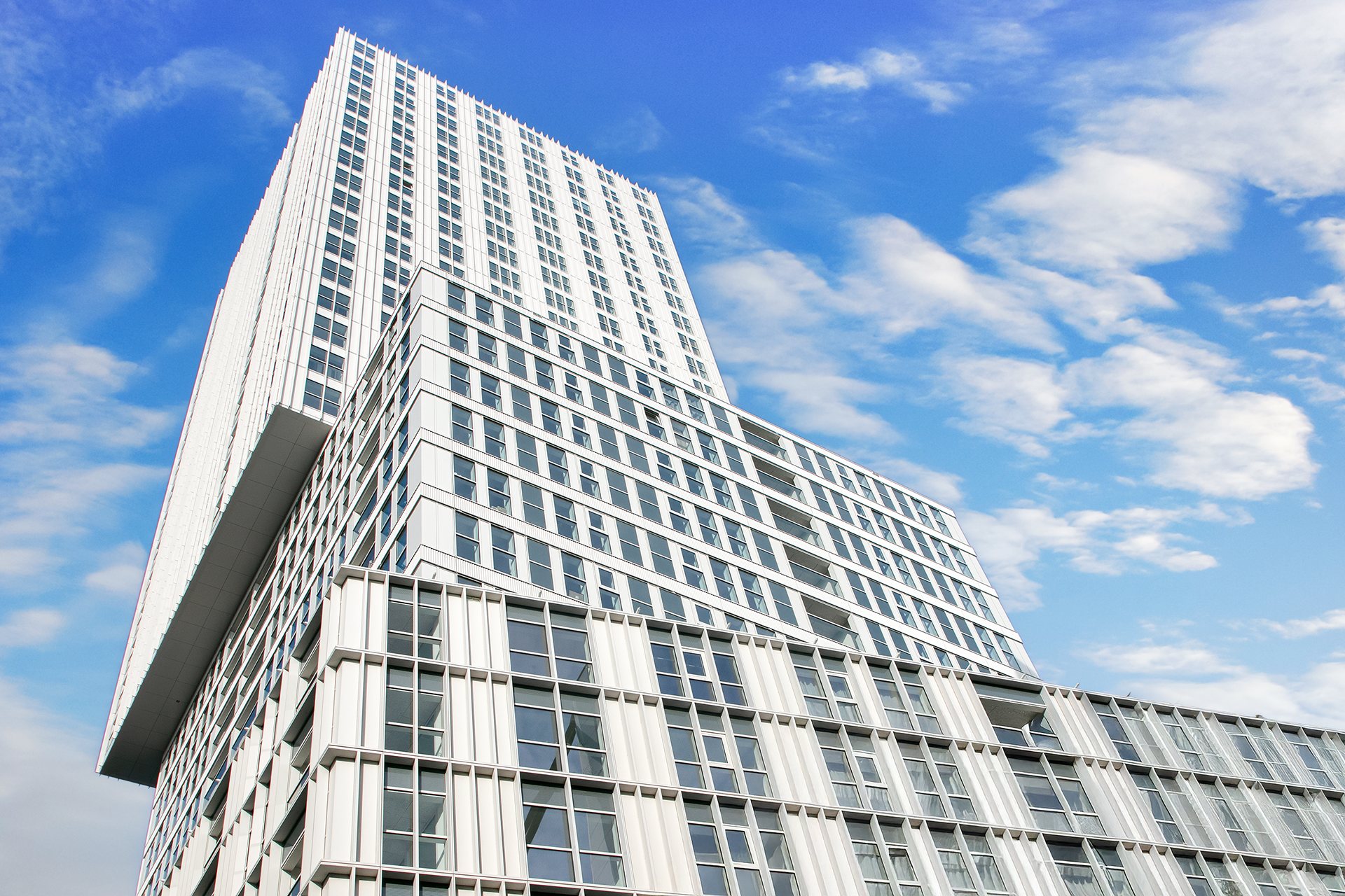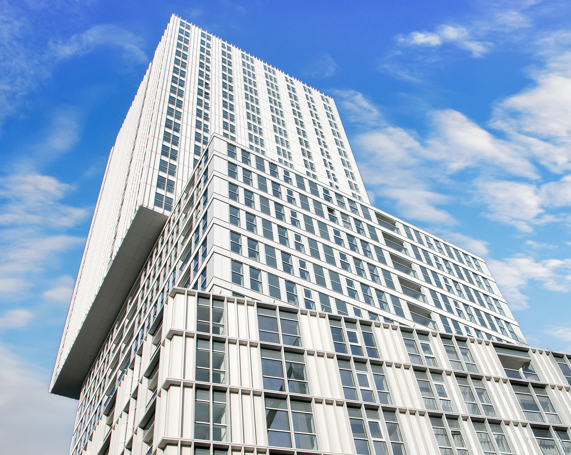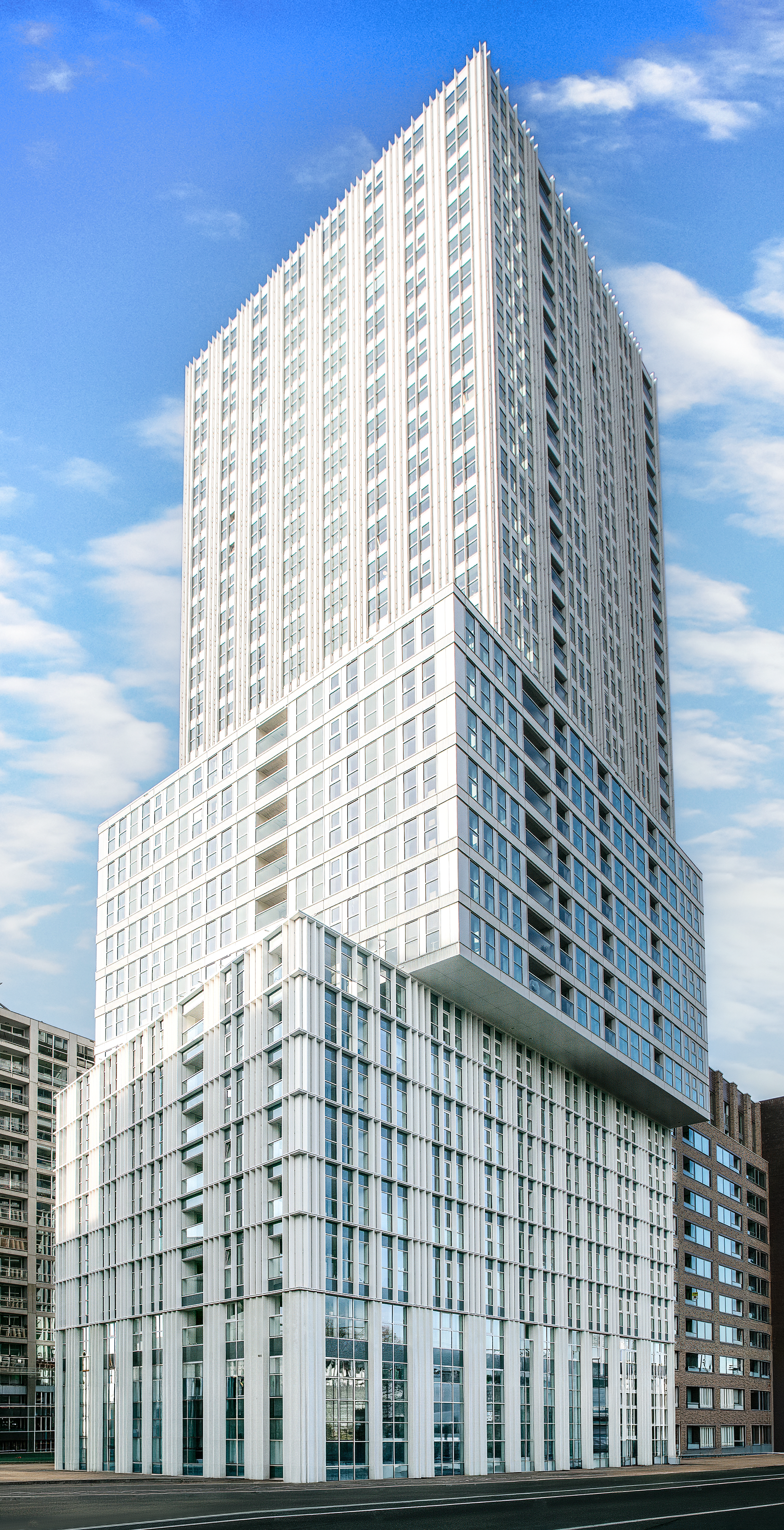 Het onderste blok telt 10 verdiepingen en op de begane grond bevindt zich de commerciële-plint, met daarboven 479 appartementen in zowel vrije als gereguleerde huursector.