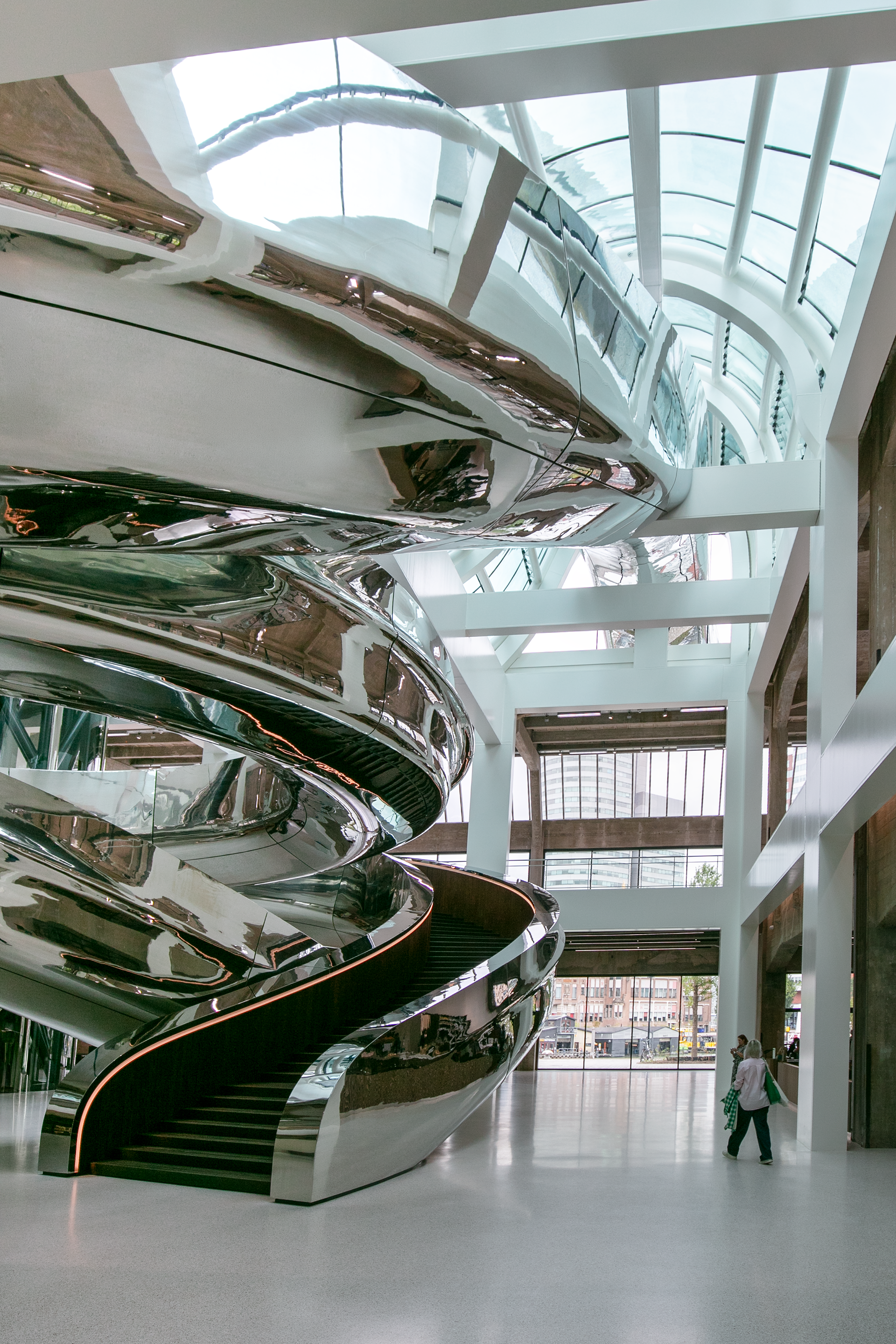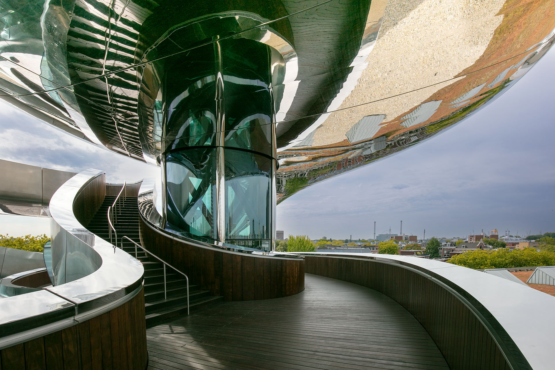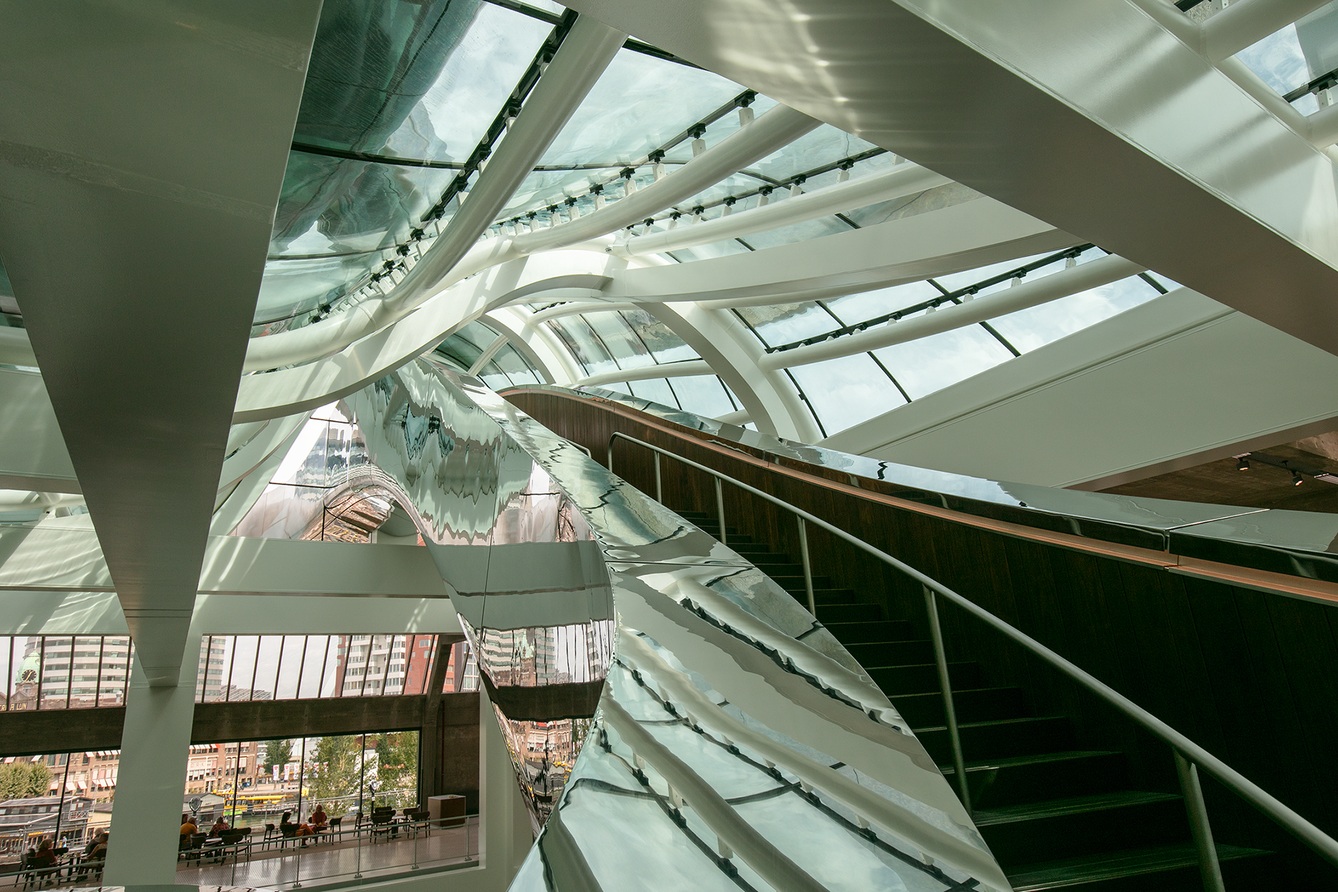 Het ontwerp van de statietrap ofwel Tornado, is een kunstwerk, een voorbeeld van hedendaagse architectuur. De statietrap is dominant en duidelijk aanwezig in het hart van het gebouw en voert de bezoekers naar een panoramadek boven het dak, waar zich een prachtig uitzicht ontvouwt over de Rijnhaven.