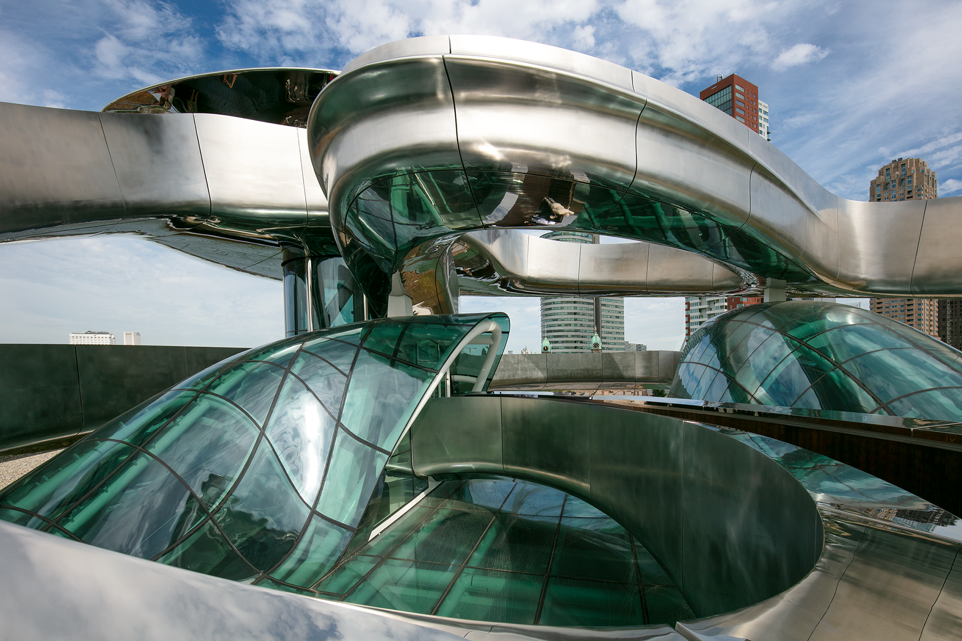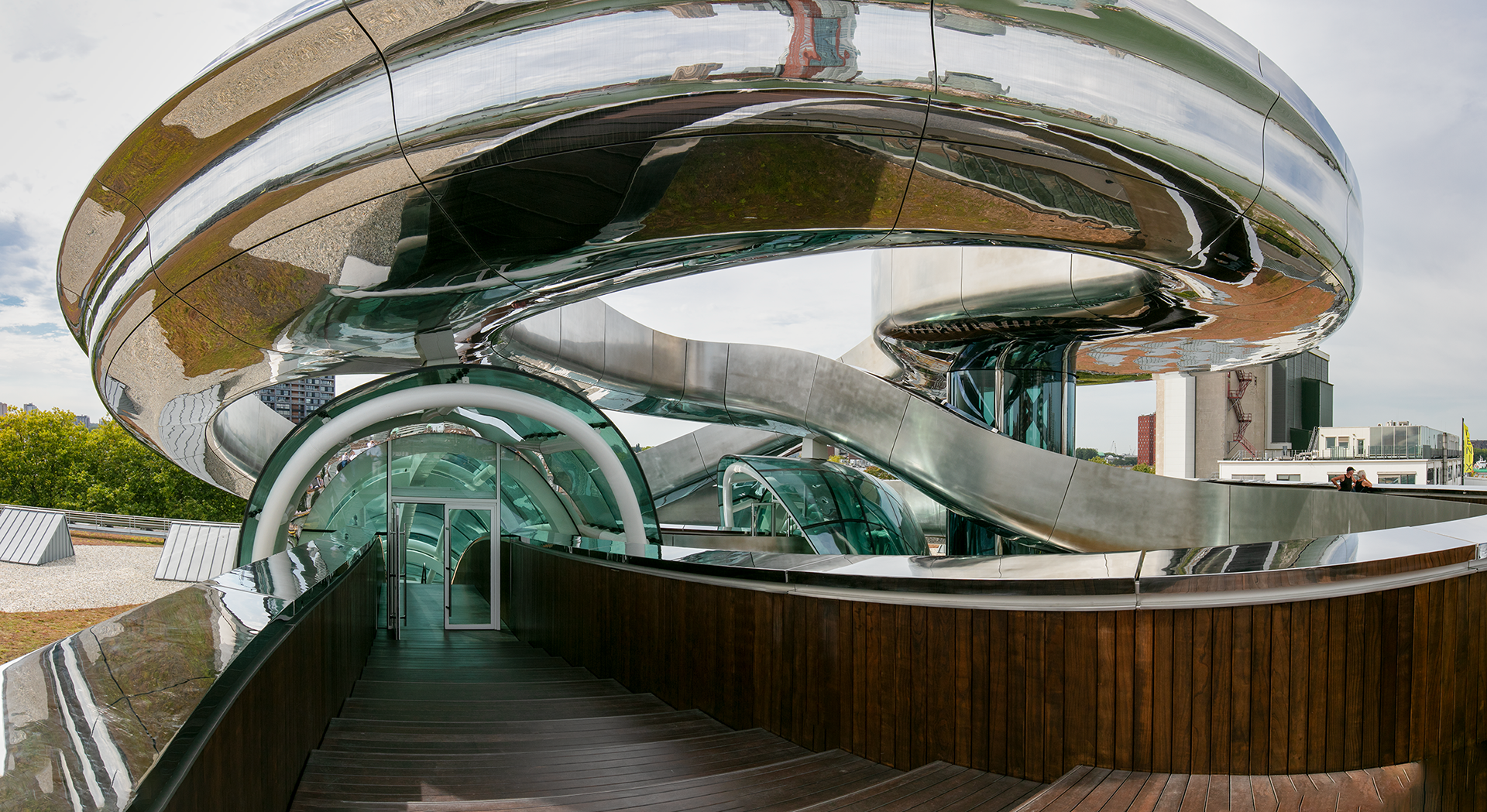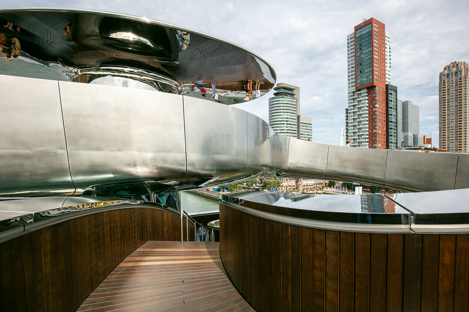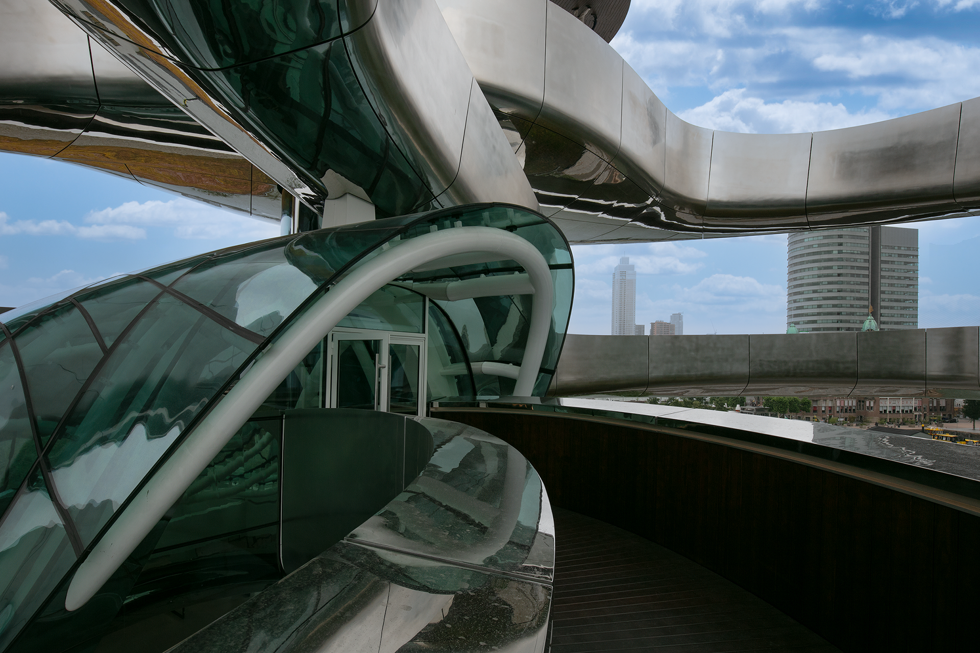 Het ontwerp van de statietrap ofwel Tornado, is een kunstwerk, een voorbeeld van hedendaagse architectuur. De statietrap is dominant en duidelijk aanwezig in het hart van het gebouw en voert de bezoekers naar een panoramadek boven het dak, waar zich een prachtig uitzicht ontvouwt over de Rijnhaven.